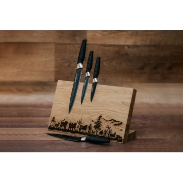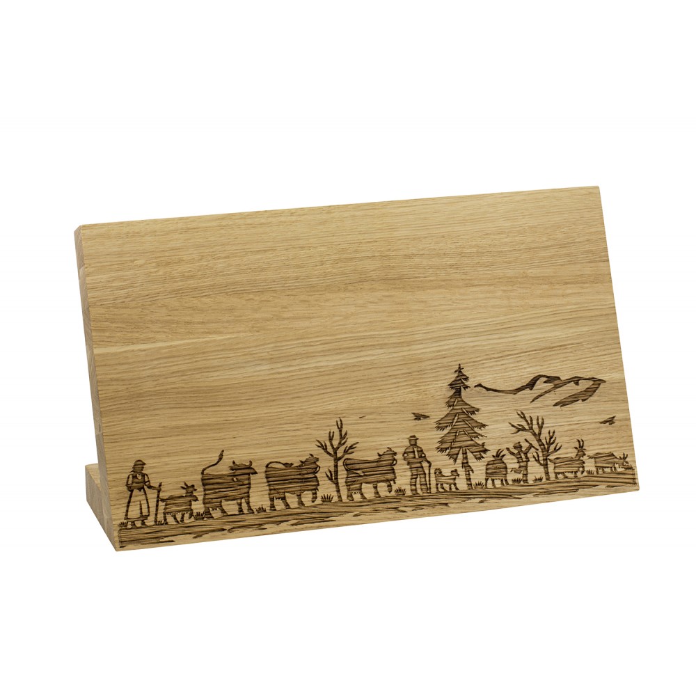 Bloc de couteau solide et magnétiquement sûr en bois de chêne avec gravure au laser. Gravé en Suisse.