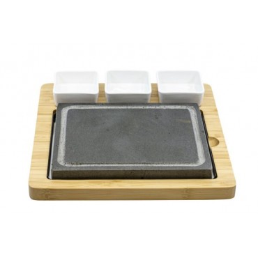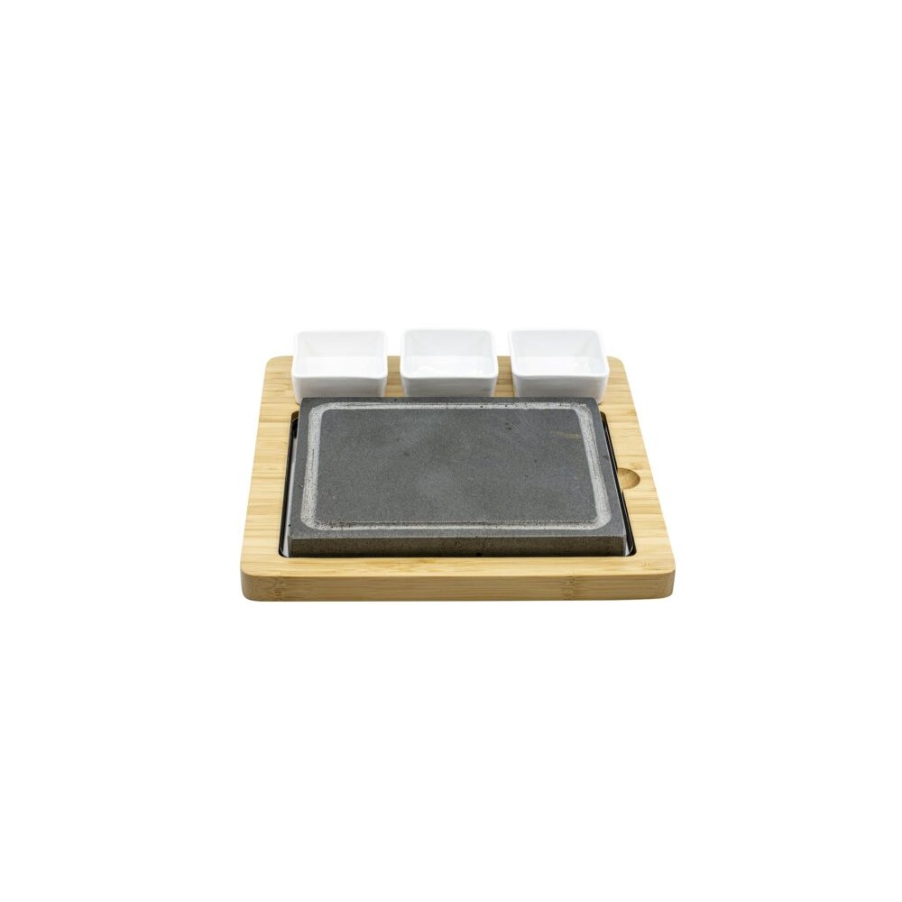 1x Plateau en bambou avec emplacement pour pierre de lave et bols en céramique, 27.5 x 28 x 2 cm